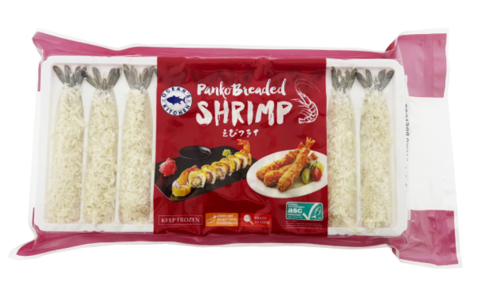 Shrimp (45%) (Litopenaeus vannamei (crustaceans), water, humectant (E451), salt), breadcrumbs (wheat flour, sugar, palm oil, yeast, salt), water, modified starch (E1420), wheat flour, salt, sugar, vegetable fat (palm fat), thickeners (E412, E415), wheat protein, starch, raising agents (E450, E500, E341), spice extract (pepper, chili pepper). Storage: Store at a temperature below -18°C. Do not refreeze after thawing. |