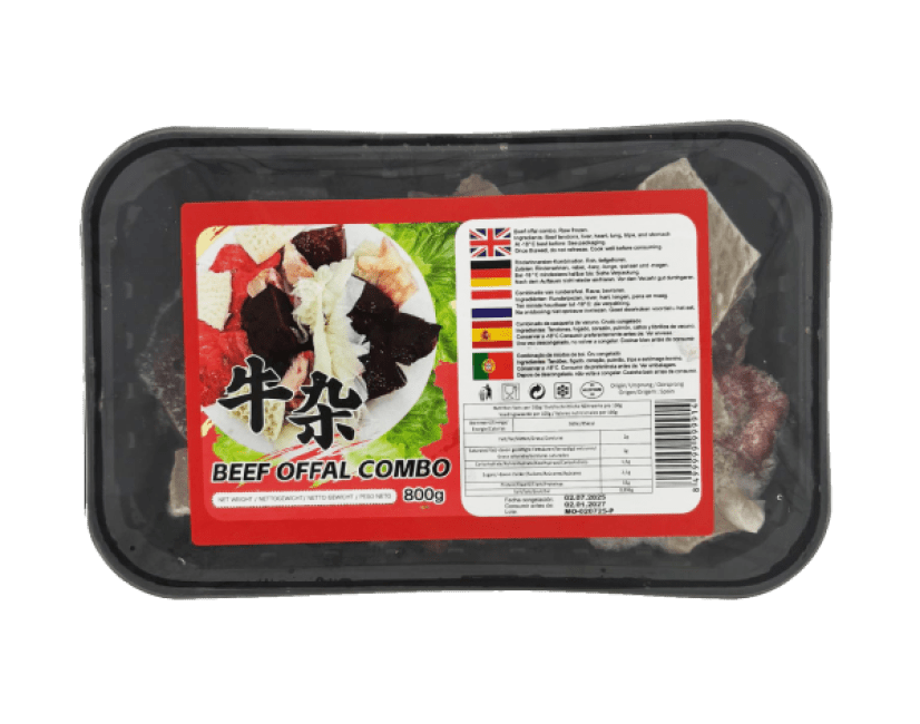Een handige diepvriesverpakking van 800 g met diverse soorten runderorgaanvlees – orgaanvlees en andere eetbare inwendige delen van rundvlees. Ideaal voor wie op zoek is naar voedzame stukken (zoals lever, nieren, pens, enz.). Deze combiverpakking biedt een mix van reststukken in één gekoelde verpakking.