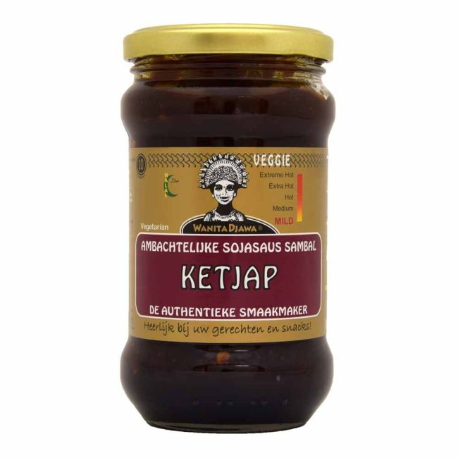Ketjap (Suiker, Water, Sojabonen Extract) (36%), Rode Pepers, Uien Knoflook, Zout, Gistextract, Krijden en Specerijen, Gemodificeerd Zetmeel (Mais), Tarwe, Voedingszuur (Citroenzuur), Kleurstof (Caramel), Conserveermiddel (Kaliumsorbaat). Na openen koel bewaren. |