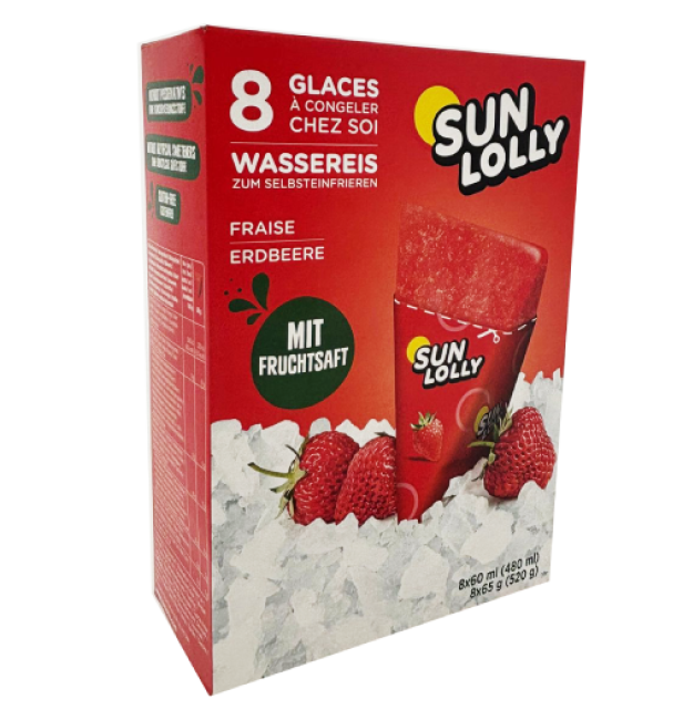 Ice lollies for home freezing with strawberry flavour. Juice content 10%. Ingredients: Water, sugar, strawberry (5%) and grape (5%) juice trom concentrate, acidity regulator (citric acid, flavourings, stabiliser (pectins), colouring food (concentrate of carrot, safflower). Store at room temperature. Freeze for 24 hours (-18°C) before consumption. Do not refreeze once thawed. |