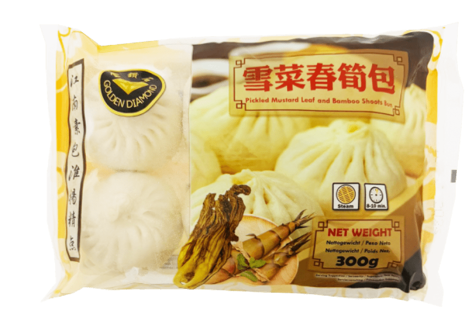 | Ingrediënten | TARWEMEEL (35,7%), GEPEKELDE MOSTERDGROENTEN (25,3%), Water, Bamboescheuten (7,8%), Suiker, Zout, Koolzaadolie, Gist, Smaakversterker (E621), Bakpoeder [Maiszetmeel, Rijsmiddel (E500), Antiklontermiddel (E555), Kleurstof (E170), TARWEMEEL]. Opslagconditie: Diepgevroren bewaren bij -18˚C. Instructies voor gebruik: Verwijder de verpakking. Ontdooien is niet nodig. Stoom gedurende 8-10 minuten op middelhoog vuur |