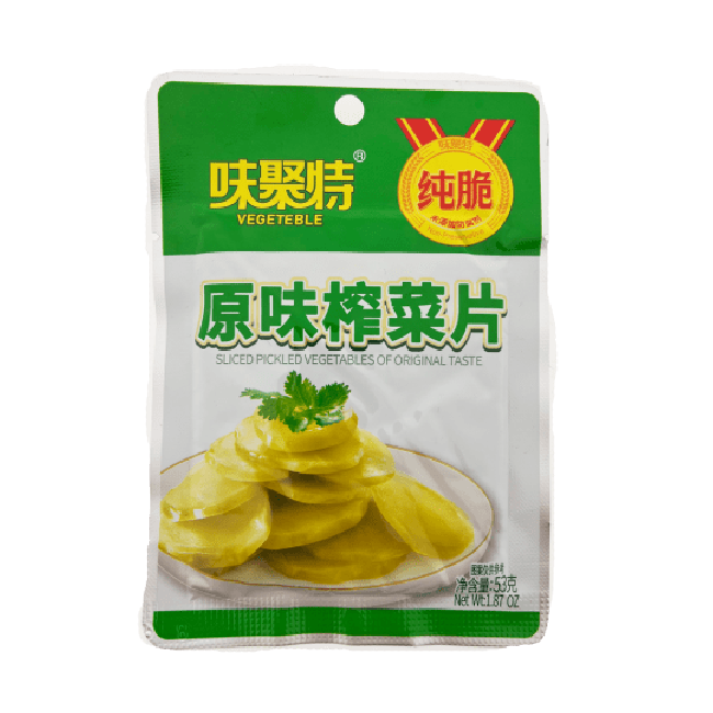 味聚特 原味腌制蔬菜片可以单独作为小吃享用,也可以作为配菜搭配一餐。它也是许多中国菜中的流行成分,为炒菜、面条和汤增添了浓郁的咸味。